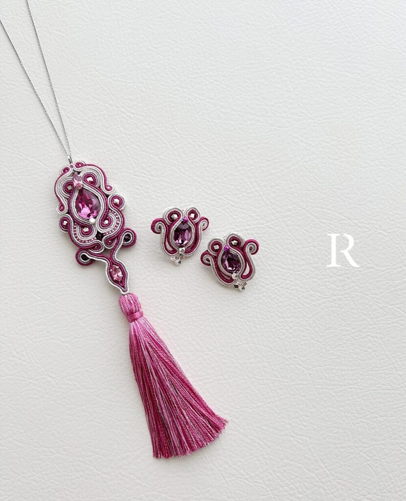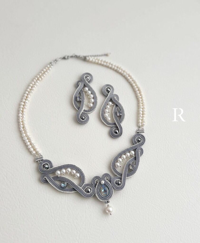 グレーのワンピースに合わせるための、特別なソウタシエネックレスとイヤリングをオーダーいただきました。